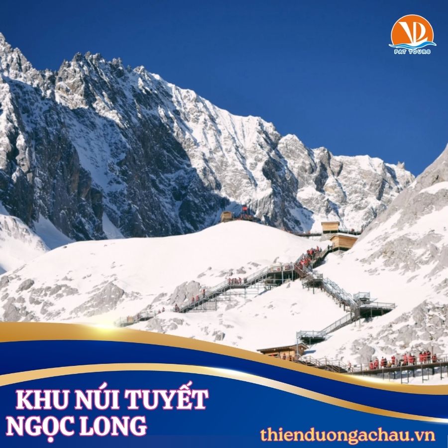 Khu Núi tuyết Ngọc Long: Quý khách đi cáp treo nhỏ lên thăm Vân Tam Bình – độ cao 3200 m ngắm cảnh đẹp Núi tuyết Ngọc Long - ngọn núi cao 5596 m tuyết phủ quanh năm. Phần băng vĩnh cửu ánh lên một màu xanh như ngọc. Lại gọi đây là núi trinh nữ vì cho đến nay con người chưa một lần chinh phục được nó. (Bao gồm cáp treo lên đỉnh Vân Sơn Bình)